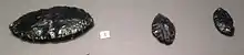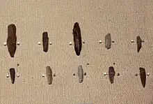- Pierres « polies ». À côté des pierres taillées (herminettes, trapézoïdes et lames) en obsidienne, de nombreuses herminettes au tranchant poli et des pierres à affuter[46] ont été découvertes en de nombreux points dispersés dans les grandes îles nipponnes centrales (Honshu et Kyushu, mais aucune à Hokkaido et Okinawa), et dans des couches du Paléolithique supérieur ancien (v. 30 000 ans BP). Aucun objet similaire n'ayant été trouvé dans les espaces voisins, tant en Chine, en Corée qu'en Russie ou ailleurs, cette production est donc spécifique au Japon[47].