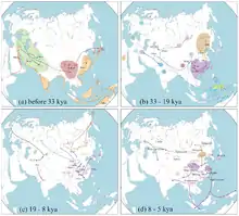 En 2014, une équipe de Shanghaï[25] a publié les résultats d'une étude de génétique sur les haplogroupes leur permettant de proposer plusieurs schémas des migrations anciennes. Selon cette étude, les îles du Japon auraient reçu un apport de population venant du sud de la Chine et, au-delà, d'une région qui aurait correspondu au Sunda de l'époque, vers 36 000 ans AP, en étant passé par l'archipel Nansei. Une seconde vague autour de 35 000 ans AP depuis une zone s'étendant de l'est de l'Inde au Yunnan aurait atteint le Japon en étant passé par la Corée (cf. carte ci-jointe).