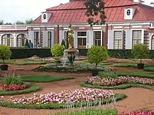 Dans la jardin en face du palais, sont disposées deux fontaines au milieu des parterres de fleurs. La plus grande partie du jardin à la française s'étend au sud à l'arrière du bâti.