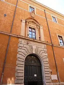 À l'intérieur, le palais conserve toujours la grande cour carrée originale de la Renaissance avec une loggia avec des arcs reposant sur des piliers et une galerie ouverte, également avec des arcs[10]. Une fontaine, initialement placée au centre de la cour, a été remontée du côté ouest[9]. Sur le mur voisin, une inscription en latin loue le pape Pie XI. L'intérieur du bâtiment montre encore des restes de fresques avec des sujets militaires et patriotiques peints après 1870. Le palais comprend également une chapelle consacrée à la Vierge de la Miséricorde. La chapelle est de plan rectangulaire, terminée par une fenêtre palladienne placée dans une chœur couvert par une voûte d'arêtes. Elle est décorée de fresques peintes en 1934 par Fra Aureliano Scaffoletti. L'autel du XIXe siècle provient de l'école détruite Piazza Pia et est surmonté d'une représentation de la Vierge de la Miséricorde flanquée de deux anges[10].