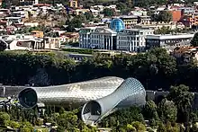 Le dôme du bâtiment, construit en verre cintré tridimensionnel en Allemagne, a été conçu par l'architecte géorgien Vakhtang Zesashvili et l'architecte italien Franc Zagari. Devant le bâtiment administratif, face à l'entrée principale se dresse un monument tournant en trois couleurs, conçu par l'ambassadrice de Géorgie en Allemagne et petite-fille du dernier empereur d'Autriche Charles Ier d'Autriche, Gabriela de Habsbourg, représentant les trois branches du gouvernement : le législatif, l'exécutif et le judiciaire[2].