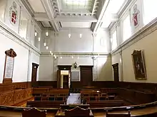 À l'extrémité de la salle, derrière la tribune sur laquelle siègent les magistrats, se trouvent la masse d'armes et baguettes d'argent des huissiers de l’ancien Sénat de Savoie.