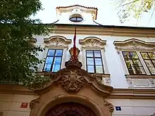 Au-dessus du portail d'entrée de la place du Grand Prieuré est le blason du Grand Prieur Gundaker Poppel, Comte de Dietrichstein, superviseur de la reconstruction baroque du palais. Les statues et la décoration du palais sont l'œuvre de Matthias Braun.