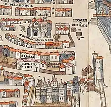 Le massacre de la Saint-Barthélemy (1572), La forteresse du Louvre est représentée au fond du tableau ; l'entrée médiévale est dominée par le pavillon du Roi construit par Lescot. |
