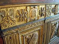| Tribune des caryatides sculptées par Goujon (1550). | L'escalier d'honneur, l'un des plus monumentaux de la Renaissance française. | Plafond de la chambre du roi, dit chambre de parade (1556). | Bas-lambris de la chambre du roi. |