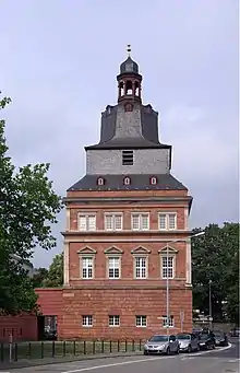 En parallèle, on a commencé à bâtir le château inférieur. Dès les années 1620, on a lancé à l'Ouest la construction d'un portail, également dans le style renaissance. Puis les travaux de construction s'arrêtèrent pendant plusieurs années lorsque l'électeur fut emprisonné pour des raisons politiques par les Habsbourg pendant la Guerre de Trente ans . Le château inférieur n'a pu être achevé qu'après la libération de Söterns. Il comprenait deux ailes longues et étroites à l'Ouest et à l'Est, qui étaient reliées directement au palais. Au Nord, un mur fermait la cour intérieure. En 1647, fut achevée la Tour rouge, un bâtiment carré massif abritant la chancellerie et les archives, au Nord-ouest du château inférieur. Ce n'est que sous l'électeur suivant, Karl Kaspar von der Leyen, que la construction du palais fut entièrement achevée [2]