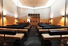 Une particulière attention a été réservée aux salles d’audiences; celles-ci sont revêtues jusqu’à mi-hauteur de panneaux en bois de hêtre, percés pour l’acoustique ; à ces panneaux, les architectes ont intégré des citations ou aphorismes qui se rattachent à l’idée de justice. On notera également l’adoption de l’arrondi dans certaines rangées de bancs, de pupitres ou de volumes de salle d’audience, expression peu utilisée dans les palais de justice en Belgique[5].