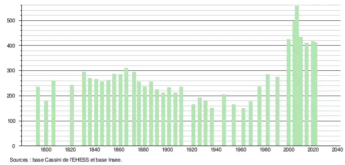 L'évolution du nombre d'habitants est connue à travers les recensements de la population effectués dans la commune depuis 1793. Pour les communes de moins de 10 000 habitants, une enquête de recensement portant sur toute la population est réalisée tous les cinq ans, les populations légales des années intermédiaires étant quant à elles estimées par interpolation ou extrapolation[38]. Pour la commune, le premier recensement exhaustif entrant dans le cadre du nouveau dispositif a été réalisé en 2004[39].