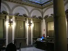 De la porte principale, on accède à la cour intérieur de Zanobi del Rosso avec des loges sur les côtés sur lesquelles sont présentes diverses finestre inginocchiate en style baroque florentin ; initialement à ciel ouvert, la cour intérieure est aujourd'hui couverte par du verre coloré installé au début du XXe siècle d'après un projet de Ulisse De Matteis qui a permis de faire de cet espace une conciergerie. Aux coins de la corniche sont présents divers masques sculptés.