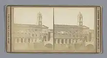 Cependant, l'ensemble de la structure a été gravement endommagé lors des bombardements de la Seconde Guerre mondiale : la partie ouest, ainsi que la tour civique, ont été quasiment rasées. La reconstruction commencée après la guerre a entraîné d'importantes modifications dans le plan de la façade principale, qui a été reconstruite à l'aide de béton armé : le portique a été prolongé sur toute la façade, tandis que la tour de l'horloge a été surélevée avec des différences significatives par rapport à la conception initiale.
