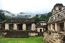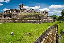 - le Palais. Figurant jadis parmi les plus beaux édifices de la période maya classique, le palais de Palenque était à l'état de ruines recouvertes de végétation quand il fut photographié par l'explorateur Alfred Maudslay, il y a plus d'un siècle ;