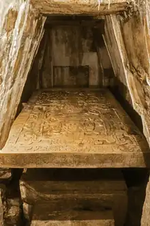 Dans le sarcophage, l'archéologue Alberto Ruz Lhuillier découvrit un squelette dont la face était couverte d'un masque de jade. Tout un trésor dormait à côté du défunt dont une partie a été volée en 1985.