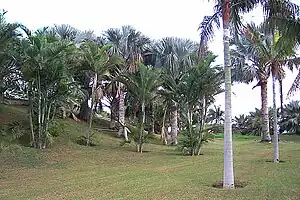 - Nouvelle Calédonie. Cette section surplombe l'océan, avec un bosquet de 50 Araucaria columnaris semé en 2001. On y trouve un bosquet de palmiers à feuilles rouges (Chambeyronia macrocarpa) et une importante collection de palmiers et d'arbres endémiques de Nouvelle-Calédonie, dont des Pandanus et des conifères de différentes espèces. Il y a aussi une collection de cultures vivrières des îles du Pacifique.