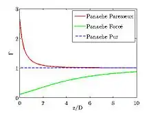 - Pour , la fonction est strictement décroissante, elle tend vers l'unité par valeurs supérieures lorsque tend vers l'infini. Ceci signifie que l'effet de flottabilité est dominant à proximité de la source. Le panache est dit paresseux (lazy).