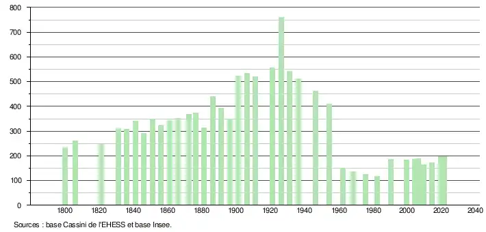L'évolution du nombre d'habitants est connue à travers les recensements de la population effectués dans la commune depuis 1800. Pour les communes de moins de 10 000 habitants, une enquête de recensement portant sur toute la population est réalisée tous les cinq ans, les populations légales des années intermédiaires étant quant à elles estimées par interpolation ou extrapolation[9]. Pour la commune, le premier recensement exhaustif entrant dans le cadre du nouveau dispositif a été réalisé en 2004[10].