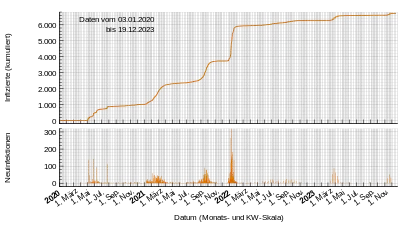 En novembre 2020 il y avait 46 nouveaux cas, portant le nombre cumulé de cas à 991 dont 17 décès[19].