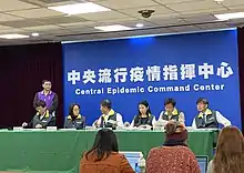 Le gouvernement taïwanais et les Centres de contrôle des maladies activent le Central Epidemic Command Center (CECC) le au niveau 3[Note 4], afin de coordonner la gestion de crise sanitaire à l'échelle nationale[2],[3],[4]. En tant que division du Centre de commandement national de la santé (NHCC) consacrée à la gestion des épidémies, lui-même créé en marge de l'épidémie de SRAS en tant que division de l'agence des CDC, le centre de commandement du CECC s'appuie sur l'expérience acquise lors des différents épisodes épidémiques ayant frappé le territoire taïwanais[2],[3],[4],[89]. Le CECC centralise les différentes actions[2] et tient une conférence de presse journalière pour faire un état des lieux sur le nombre de nouveaux cas et éventuels décès et guérisons, un point détaillé sur chacune des infections, une mise à jour des restrictions des flux humains et des nouvelles mesures entreprises[4],[21]. Elles contiennent également des rappels sur les règles de sécurité ainsi que sur les comportements-barrière qui sont particulièrement respectées ; le port du masque était par exemple déjà un réflexe culturel dans le cas d'une maladie[22]. L'activation du CECC permet également d'intégrer les ressources nationales administratives, académiques, et des secteurs privés afin de lutter contre cette nouvelle maladie[87].