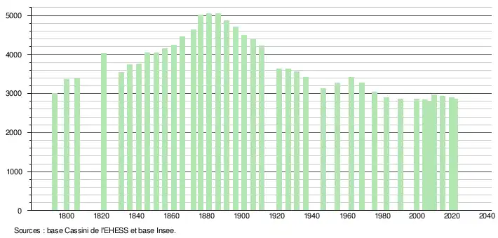 L'évolution du nombre d'habitants est connue à travers les recensements de la population effectués dans la commune depuis 1793. Pour les communes de moins de 10 000 habitants, une enquête de recensement portant sur toute la population est réalisée tous les cinq ans, les populations légales des années intermédiaires étant quant à elles estimées par interpolation ou extrapolation[31]. Pour la commune, le premier recensement exhaustif entrant dans le cadre du nouveau dispositif a été réalisé en 2004[32].