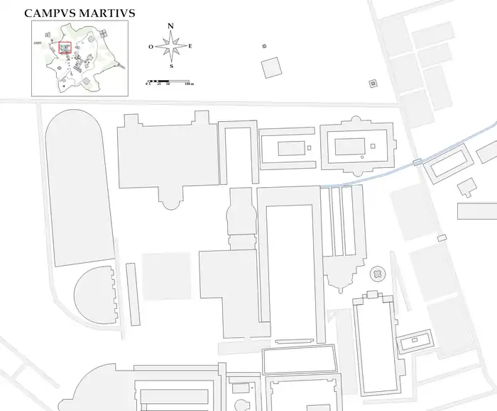 L'implantation du Panthéon sur le Champ de Mars est proche de l'ancien marais de la Chèvre (Caprae palus), que la tradition associe à la disparition mystique de Romulus[31] et qu'Agrippa aménage en bassin (Stagnum Agrippae). Cette proximité associe ainsi Romulus, fondateur de Rome, et Auguste, comme refondateur de Rome et second Romulus[32].