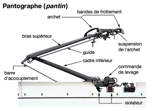 Le pantographe est le dispositif articulé qui permet à une locomotive électrique ou à un tramway ou à d'autres systèmes automoteurs électriques de capter le courant par frottement sur une caténaire.