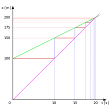 Graphique du paradoxe : cas où Achille se déplace à 10 mètres par seconde, et la tortue à la moitié de sa vitesse.