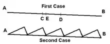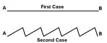 - Dans le second cas, on inclut un profil en dents de scie dans la région comprise entre les points A et B. Ici aussi la bille va rouler de manière aléatoire vers l'une ou l'autre des extrémités avec des probabilités égales.