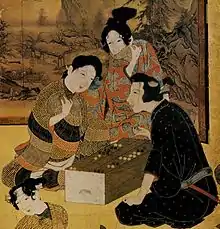 Le paravent de 94 × 274,8 cm[1] dépeint une scène dans laquelle onze personnages masculins et féminins se divertissent. Sur la gauche, un homme aveugle et quelques femmes jouent du shamisen devant un byōbu à quatre panneaux orné d'un paysage. À leur droite, un groupe d'hommes et de femmes jouent au jeu du sugoroku sur un plateau[2].