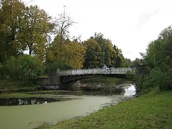 - Deux ponts, le pont Bossu et le pont Noir conduisent à une petite île. Le premier est construit en tuffeau par Cameron en 1784 sous forme de ruines et le second est construit par Cameron dans les années 1780 et reconstruit par Brenna en métal.