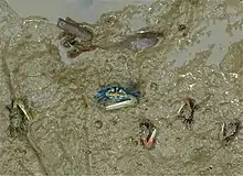 Les crabes sont omniprésents, en particulier les crabes violonistes Uca, surtout dans la mangrove.