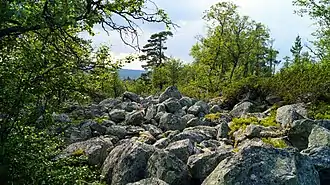 Une grande partie du parc est couvert d'une forêt primaire de pin sylvestre (Pinus sylvestris)[7]. Les conditions sont difficiles, avec un sol pauvre et rocheux et un climat peu clément, et les arbres poussent très lentement, et rarement très haut[7]. Cependant, ces pins sont très resistants et beaucoup des arbres du parc atteignent plus de 500 ans[7]. Ceci n'empêche pas la présence de bois mort, qui est important pour le développement de nombreuses espèces, en particulier de Fungi, plantes et insectes[7]. Plusieurs de ces espèces sont devenues rares en Suède à cause de l'exploitation de la plupart des forêts du pays[7]. Dans le parc, on trouve par exemple le lichen Letharia vulpina, menacé en Suède[7]. Parfois, le terrain est tellement rocheux que même les pins ne s'y développent pas, et on trouve alors quelques bouleaux pubescents (Betula pubescens)[7].