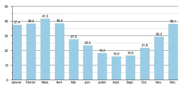 | Nombre de jours avec précipitations | 12,8 | 12,4 | 12,3 | 12,2 | 14,9 | 12,1 | 13,4 | 13,1 | 11,7 | 13,2 | 13,4 | 14,4 | 155,9 |