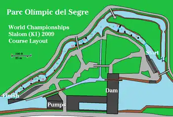 Le parcours de compétition en eau vive mesure 300 m de long, avec un dénivelé de 6,5 m, soit une pente de 2,2% ou 22 m/km. Le débit naturel de la rivière Sègre est détourné en partie grâce à un barrage de dérivation en amont. Dans des conditions de faible débit, quatre pompes de 300 kilowatts peuvent ajouter jusqu'à 12 m³/s au débit du cours, afin de l'augmenter au maximum du cours de 17,5 m³/s. Lorsque le parcours n'est pas utilisé, ou lorsque le débit naturel dépasse 17,5 m³/s, les pompes sont inversées et tournent en mode turbine pour produire de l'électricité pour la ville.