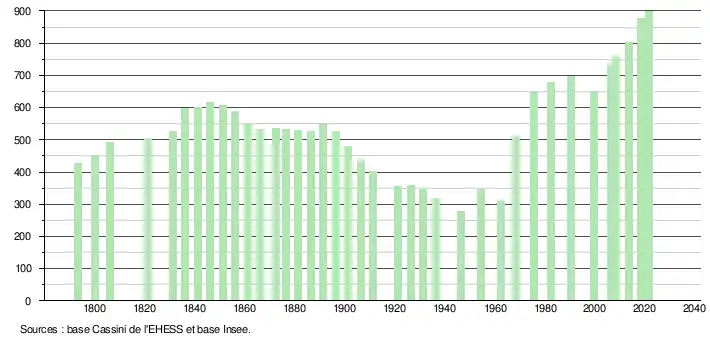 L'évolution du nombre d'habitants est connue à travers les recensements de la population effectués dans la commune depuis 1793. Pour les communes de moins de 10 000 habitants, une enquête de recensement portant sur toute la population est réalisée tous les cinq ans, les populations légales des années intermédiaires étant quant à elles estimées par interpolation ou extrapolation[23]. Pour la commune, le premier recensement exhaustif entrant dans le cadre du nouveau dispositif a été réalisé en 2008[24].