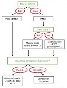Dans le cas des ostéoradionécroses, la stabilisation pariétale n'est souvent pas nécessaire en raison de la raideur fibreuse des tissus environnants[15],[12]. La priorité est à l'apport de tissu bien vascularisé, par un lambeau, afin de permettre la cicatrisation[15],[18].