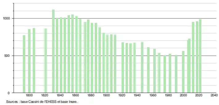 L'évolution du nombre d'habitants est connue à travers les recensements de la population effectués dans la commune depuis 1793. Pour les communes de moins de 10 000 habitants, une enquête de recensement portant sur toute la population est réalisée tous les cinq ans, les populations légales des années intermédiaires étant quant à elles estimées par interpolation ou extrapolation[33]. Pour la commune, le premier recensement exhaustif entrant dans le cadre du nouveau dispositif a été réalisé en 2007[34].