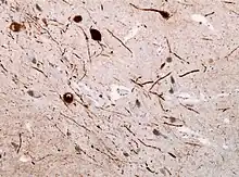 La maladie est caractérisée par l'agrégation en structures amyloïdes de protéines du SNC, les α-synucléines, à la suite de mauvais repliements. Ces α-synucléines s'associent en fibrilles puis forment des corps de Lewy déplaçant les organites intracellulaires au sein des neurones. L'α-synucléine forme des protéines pouvant se comporter comme un prion et dont on soupçonne un rôle dans l'origine de la maladie de Parkinson[36]. Toutefois les causes originelles, processus ou facteurs de risque de cette maladie sont encore mal connus[37]. La maladie de Parkinson est une maladie idiopathique aux causes multiples qui entraînent la mort des neurones. Ils pourraient être la conséquence de l'interaction entre une prédisposition génétique (surtout chez des sujets de moins de 50 ans[38]) et des cofacteurs environnementaux. Depuis de nombreuses années, des facteurs causaux tels que les agents toxiques environnementaux, les métaux lourds et les pesticides sont suspectés[12]. Le premier facteur de risque reste avant tout l'âge même s'il y a des patients jeunes pour les formes génétiques de la maladie, ce qui fait de la maladie de Parkinson une maladie du vieillissement[39]. En France, depuis 2012, la maladie de Parkinson est reconnue maladie professionnelle par la mutualité sociale agricole[40],[41]. Les agriculteurs ayant manipulé des pesticides pendant au moins 10 ans sont susceptibles d'être pris en charge à 100 % et d'être indemnisés[11].