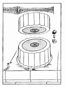 - Pour le montage d'une colonne, fallait-il être capable de déposer en douceur un tambour de plus d'une tonne suspendu au-dessus de celui qui allait le supporter, tout en ayant la possibilité de le déplacer facilement pour l'ajuster à la perfection ; pour cela, on encastrait les deux parties d'une broche métallique (en fer malléable ou en bronze) scellée avec du plomb fondu et d'une clavette en bois de cèdre dans deux demi-cubes en bois de cyprès (système à empolia et poloi) ménagés au centre de chacune des deux faces à mettre en contact pour maintenir deux tambours de colonne. On en avait retrouvé un certain nombre (la partie « mâle » dans l'une et la partie « femelle » dans l'autre), le guidage et le positionnement recherchés s'effectuant au cours de l'emboîtement progressif jusqu'au blocage final.