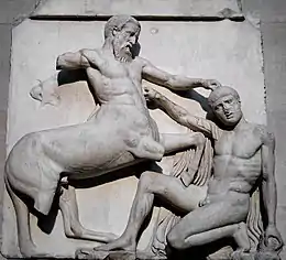 Les métopes du côté sud (I-XII et XXI-XXXVII), à l'exception des problématiques métopes XIII-XX aujourd'hui perdues, montrent la Centauromachie ou combat des Lapithes et des Centaures (combat mythique des Lapithes aidés par Thésée contre les Centaures, mi-hommes, mi-chevaux, en Thessalie). Les Centaures sont figurés avec des traits rappelant ceux des masques de théâtre ; ils sont vêtus de peaux d'animaux et sont armés de branches d'arbres. Les Lapithes sont figurés nus ou vêtus de la chlamyde ; ils portent des épées et des boucliers, avec des éléments métalliques véritables qui se trouvaient insérés dans la pierre. On distingue aussi des hydries, qui semblent indiquer une bataille se déroulant à l'intérieur de bâtiments. Contrairement à ce qu'on attendrait d'un point de vue moral, ce sont les Centaures qui semblent l'emporter sur les Lapithes, du moins à cette phase de la bataille.
