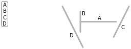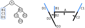 | L'espace contient quatre segments de droite {A, B, C, D} ; s'il s'agissait d'un problème de rendu 3D, ce seraient des polygones formant une « scène ». Dans l'arbre, les nœuds de l'arbre sont dans des cercles, et les listes d'objets devant ou derrière sont dans des rectangles arrondis. Le côté avant de chaque segment est indiqué par une flèche | ![]() | |