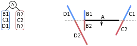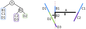 | ii. | Nous considérons les segments situés devant A, {B2, C2, D2}. Nous créons un nœud enfant, nous choisissons un segment arbitraire, B2, et nous l'ajoutons à ce nœud. Nous coupons le segment sécant avec la droite portant B2, ce qui crée deux nouveaux segments, {D2, D3}. Nous séparons les segments situés devant B2, {D2}, et ceux situés derrière, {C2, D3}. | ![]() |