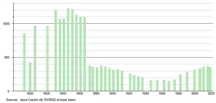 L'évolution du nombre d'habitants est connue à travers les recensements de la population effectués dans la commune depuis 1793. Pour les communes de moins de 10 000 habitants, une enquête de recensement portant sur toute la population est réalisée tous les cinq ans, les populations légales des années intermédiaires étant quant à elles estimées par interpolation ou extrapolation[4]. Pour la commune, le premier recensement exhaustif entrant dans le cadre du nouveau dispositif a été réalisé en 2005[5].