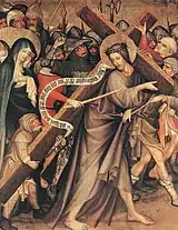 | La Montée au Calvaire | Matthieu 27, 32-33[1] ; Marc 15, 21-22[1] ; Luc 23, 26[1] ; Jean 19, 17[1] | Cet épisode est un incontournable des cycles de la Passion du Christ et permet de mettre en scène de nombreux personnages. Nous avons au centre Jésus qui porte sa croix, pouvant être accompagné de Simon de Cyrène et parfois des deux larrons. La Vierge et des saintes femmes peuvent aussi suivre le cortège et être arrêtées par des soldats. | ![]() Maître Thomas de Coloswar, Le Christ portant le croix, retable Garamszentbenedek, 1427, tempera sur bois, Esztergom, musée chrétien |