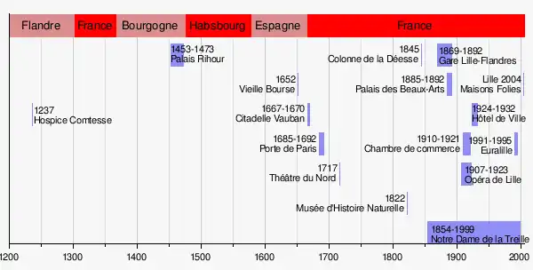 - Le cadre général des paragraphes qui suivent est issu de l'exploitation de l'ouvrage Le Patrimoine des Communes du Nord, Éditions Flohic, 2001, Tome 2, p. 964 à 1082, qui décrit chaque édifice remarquable de Lille par ordre chronologique.