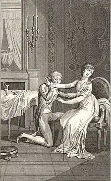 Dans l'édition de Paris, 1797-1798, on trouve un frontispice représentant un homme agenouillé devant une femme et lui mordant le bras, avec la légende[1] :