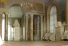 Sous le règne de Gustave III, la salle des miroirs est aussi appelée salle de lecture. L'idée est qu'une personne vienne y faire la lecture d'œuvres littéraires à voix haute. Avec le remplacement des colonnes de grès par des colonnes de marbre en 1849, la façade sud est recouverte des vitrages que l'on peut encore voir aujourd'hui. Le souci du détail se manifeste aussi dans l'alimentation des poêles, qui se fait depuis l'extérieur, via une ouverture dans les murs[9]. Avec ses colonnes, ses larges miroirs et ses décorations dorées et blanches, la salle des miroirs représente selon l'historien d'art Nils G. Wollin (sv) « l'une des réalisations les plus envoutantes de l'architecture suédoise[6] ». À la mort de Gustave III, l'ameublement de la pièce n'est pas encore complété.