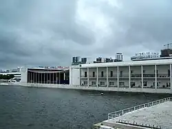 L’entrée de l’édifice se fait par une large place couverte par un imposant voile de béton précontraint, qui, se basant sur l’idée d’une feuille de papier posée entre deux briques, ouvre un espace urbain pouvant héberger les divers événements qu’un espace de cette échelle peut contenir.