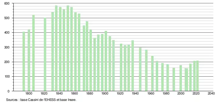 L'évolution du nombre d'habitants est connue à travers les recensements de la population effectués dans la commune depuis 1793. Pour les communes de moins de 10 000 habitants, une enquête de recensement portant sur toute la population est réalisée tous les cinq ans, les populations légales des années intermédiaires étant quant à elles estimées par interpolation ou extrapolation[25]. Pour la commune, le premier recensement exhaustif entrant dans le cadre du nouveau dispositif a été réalisé en 2007[26].