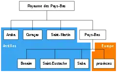 Le royaume des Pays-Bas est constitué, depuis la dissolution de la fédération des Antilles néerlandaises le , de quatre territoires autonomes[38] : les Pays-Bas, Aruba, Curaçao et Saint-Martin.