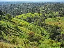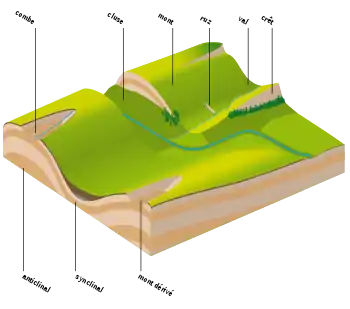 - il est d'une part considéré comme un système (géosystème ou géocomplexe[5] notamment décrit et analysé par la géographie, l'histoire, la géologie, l'écologie du paysage). Ce système est modelé par des facteurs naturels abiotiques (physiques, chimiques) et biotiques (biologiques), ainsi que par des facteurs anthropiques, qu'on peut distinguer à différentes échelles, éventuellement hiérarchisées. Le paysage peut de ce point de vue présenter une écopotentialité non exprimée (cachée dans la banque de graines du sol par exemple), mais qu'on pourrait révéler ;