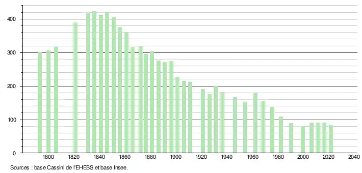 | L'évolution du nombre d'habitants est connue à travers les recensements de la population effectués dans la commune depuis 1793. Pour les communes de moins de 10 000 habitants, une enquête de recensement portant sur toute la population est réalisée tous les cinq ans, les populations légales des années intermédiaires étant quant à elles estimées par interpolation ou extrapolation[33]. Pour la commune, le premier recensement exhaustif entrant dans le cadre du nouveau dispositif a été réalisé en 2006[34]. En 2021, la commune comptait 83 habitants[Note 7], en diminution de 7,78 % par rapport à 2015 (Haute-Garonne : +7,43 %, France hors Mayotte : +1,84 %). |